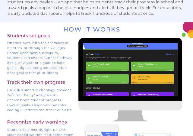 UR TURN, SBC is a woman-owned social benefit corporation (SBC) has developed goal setting and progress-tracking app for high school students --especially those who are the first in their family to aspire to college. Think of UR TURN like a FitBit for… UR TURN, SBC is a woman-owned social benefit corporation (SBC) has developed goal setting and progress-tracking app for high school students --especially those who are the first in their family to aspire to college. Think of UR TURN like a FitBit for education complete with supportive nudges. UR TURN is a smart advising technology that charts a pathway for school success offering course corrections (chatbots, text and email messaging) when students get off track. Educational goals that students can set include: reduced absenteeism, improved GPA, career pathway course completion, college readiness, progress toward successful high school completion, and eligibility for 2-year and 4-year colleges.