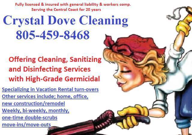 Crystal Dove Cleaning offers professional cleaning at reasonable, competitive rates. Specializing in post-construction cleaning, private residential cleaning, move-out cleaning, vacation rental turnover cleaning, janitorial service, and handyman… Crystal Dove Cleaning offers professional cleaning at reasonable, competitive rates. Specializing in post-construction cleaning, private residential cleaning, move-out cleaning, vacation rental turnover cleaning, janitorial service, and handyman service. Crystal Dove Cleaning is 100% woman-owned and we provide jobs for disabled veterans and low-income families, giving them a hand up rather than a handout.